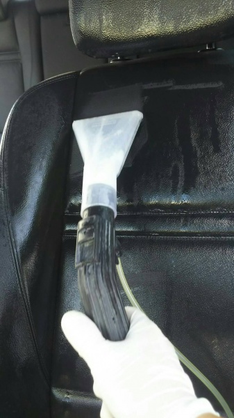 革シートに、CCTの洗剤を使用し、洗浄・消毒・すすぎ洗いをしていきます。